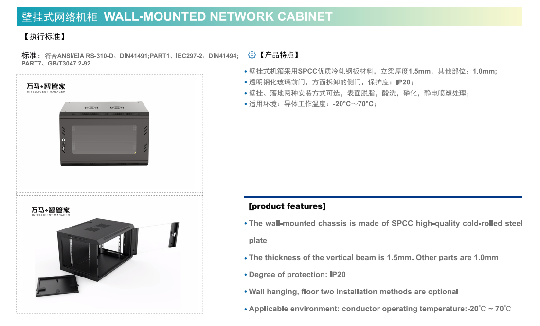 The material is high-quality SPCC cold-rolled steel plate, the thickness of the angle gauge is 2.0 mm, the thickness of the frame is 1.5 mm, and the thickness of other main components is 1.2 mm; static load: ≥1000KG, protection level: IP20;